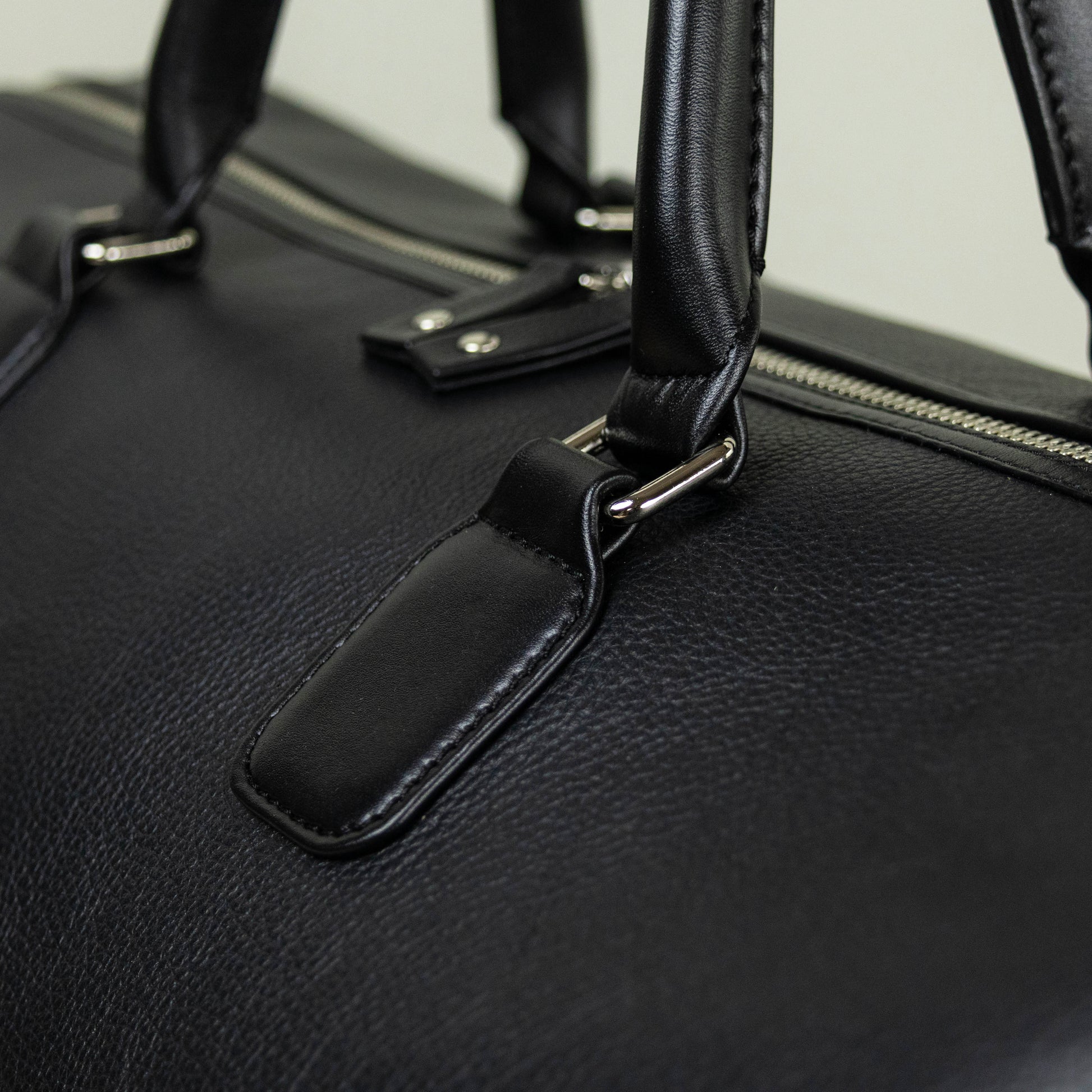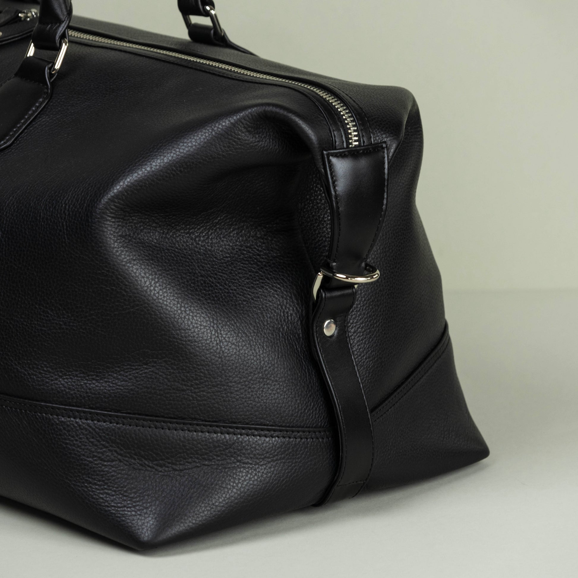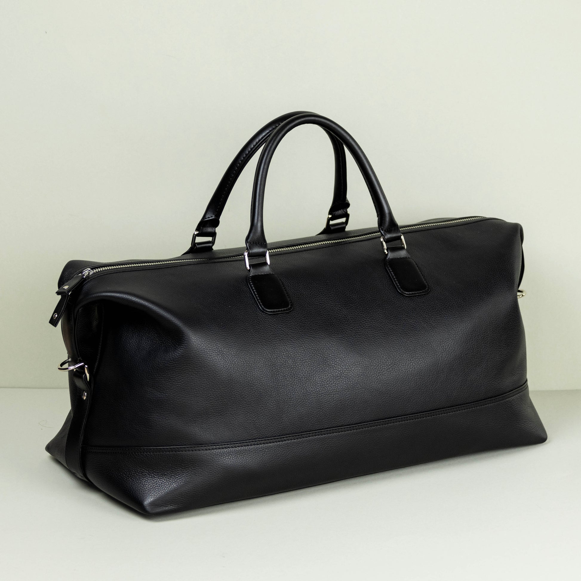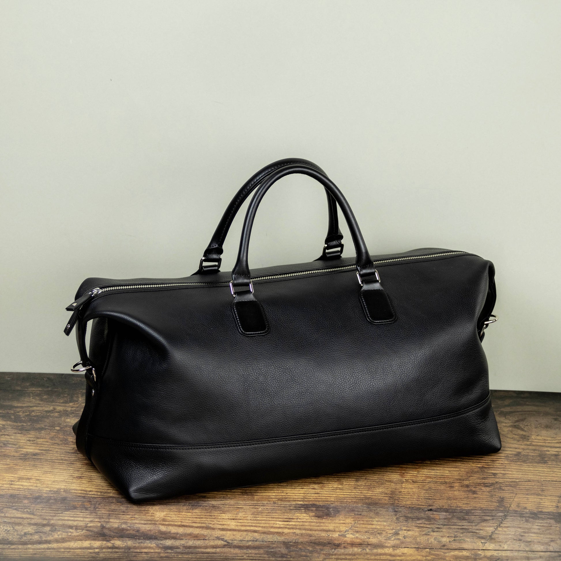 A Duffle Bag in Black Pebble Grain Leather for weekend or overnight travel, with a Zipper Closure.