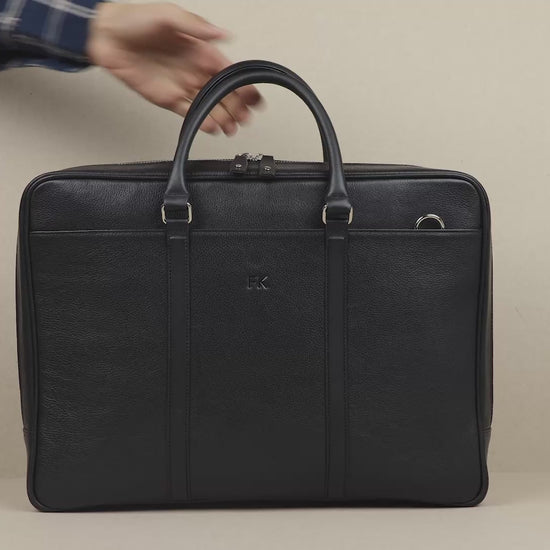 A slim leather briefcase for men in black. A completely handmade product featuring top handles and a zip around closure for carrying upto a 16 inch laptop and documents. Thoughtfully designed with timeless elegance with practical functionality.