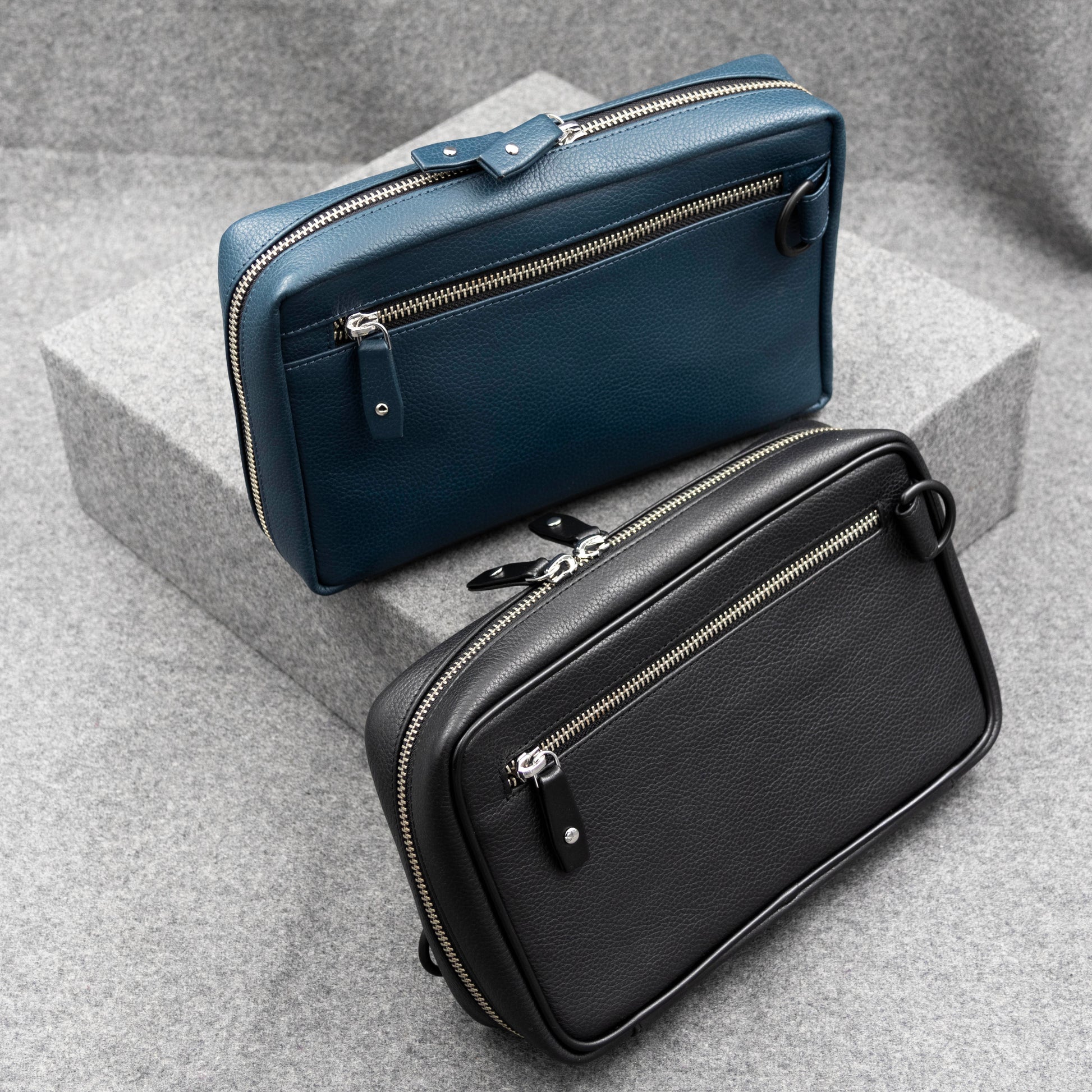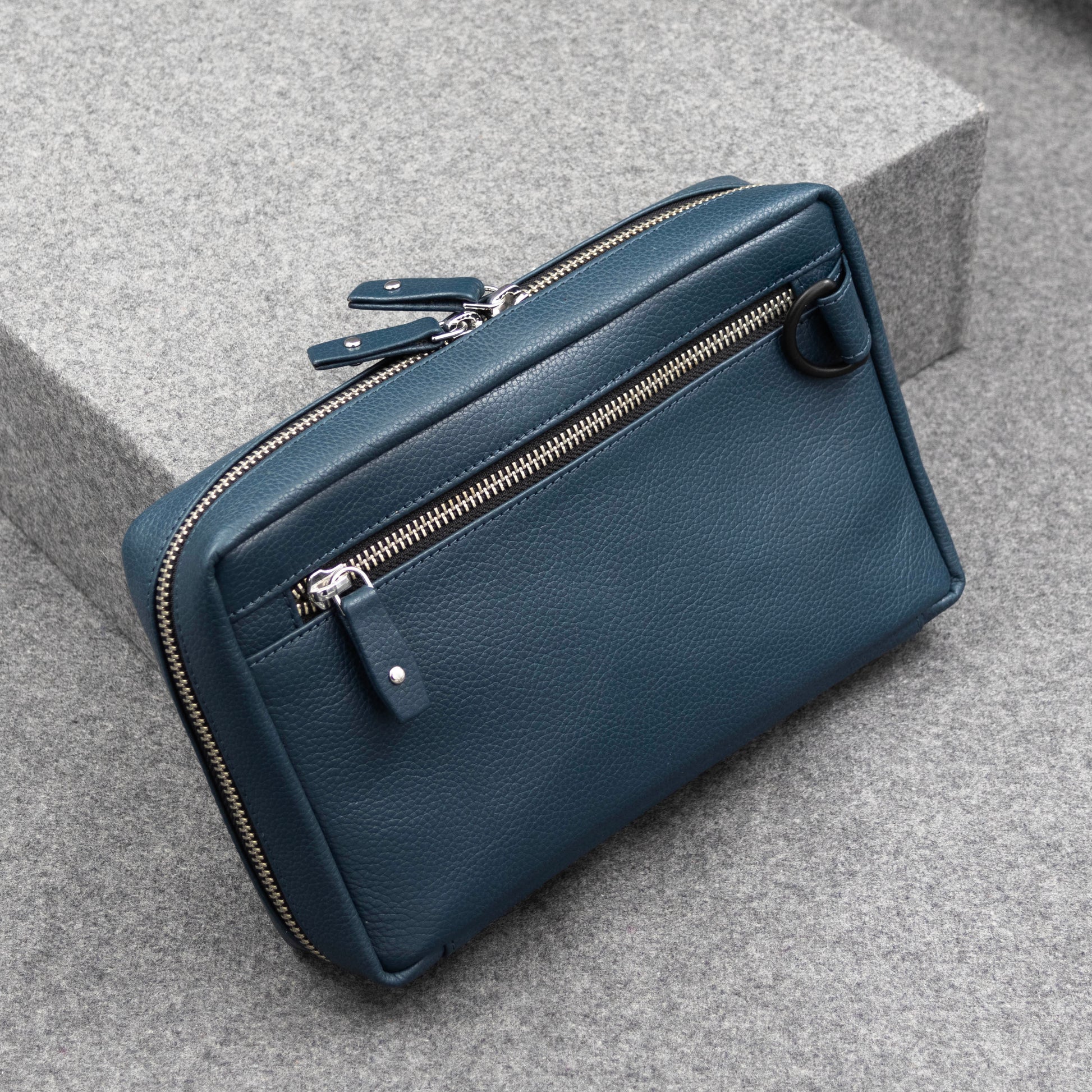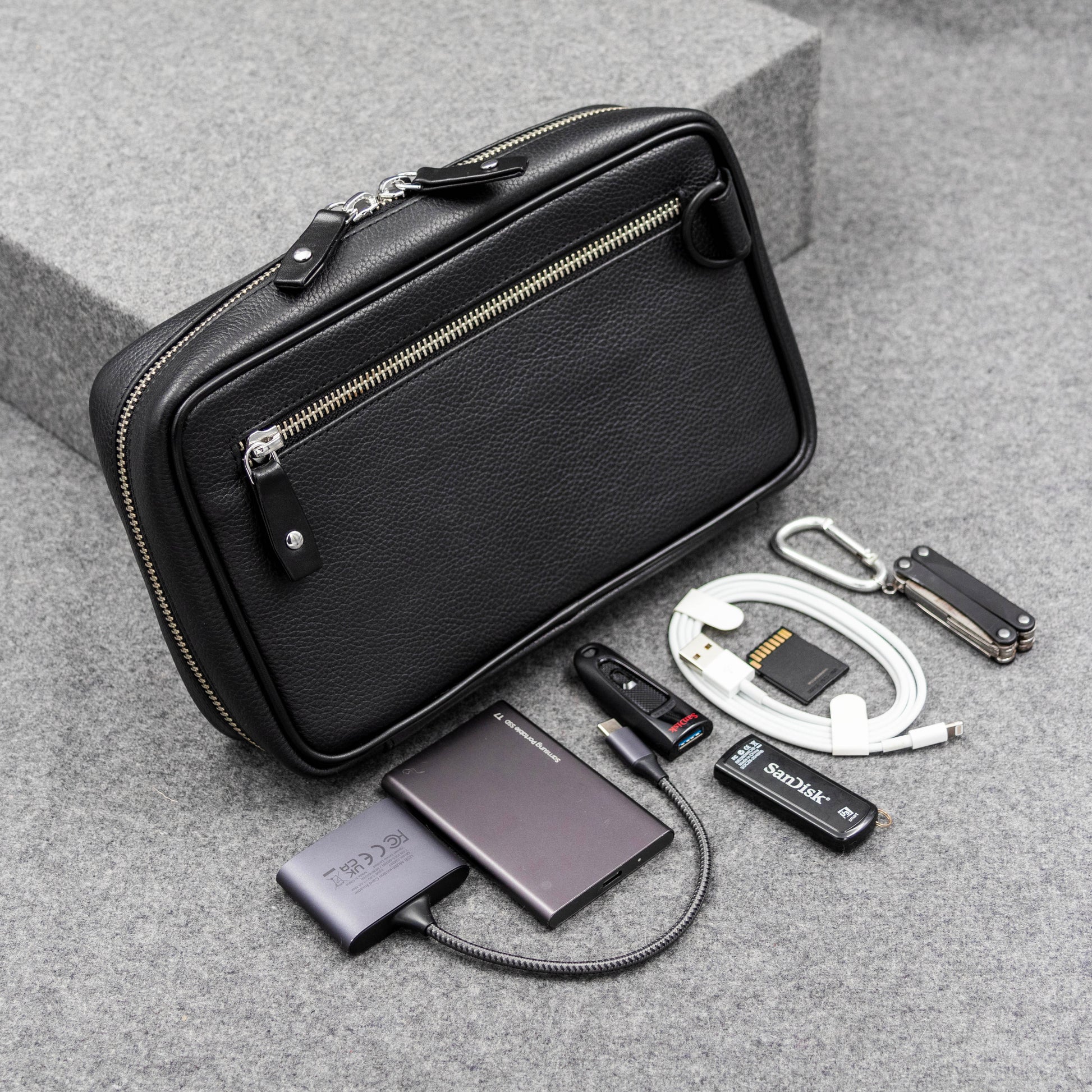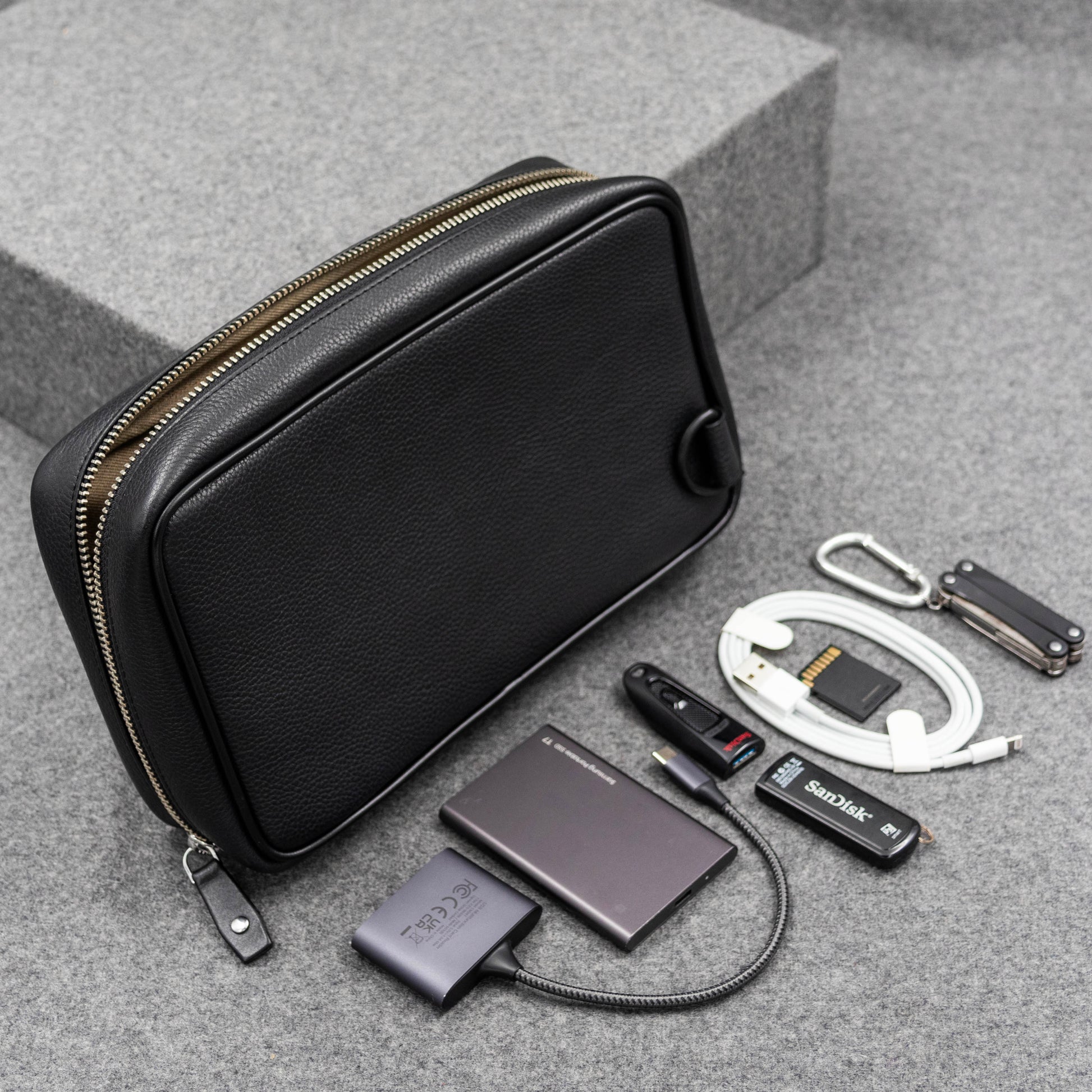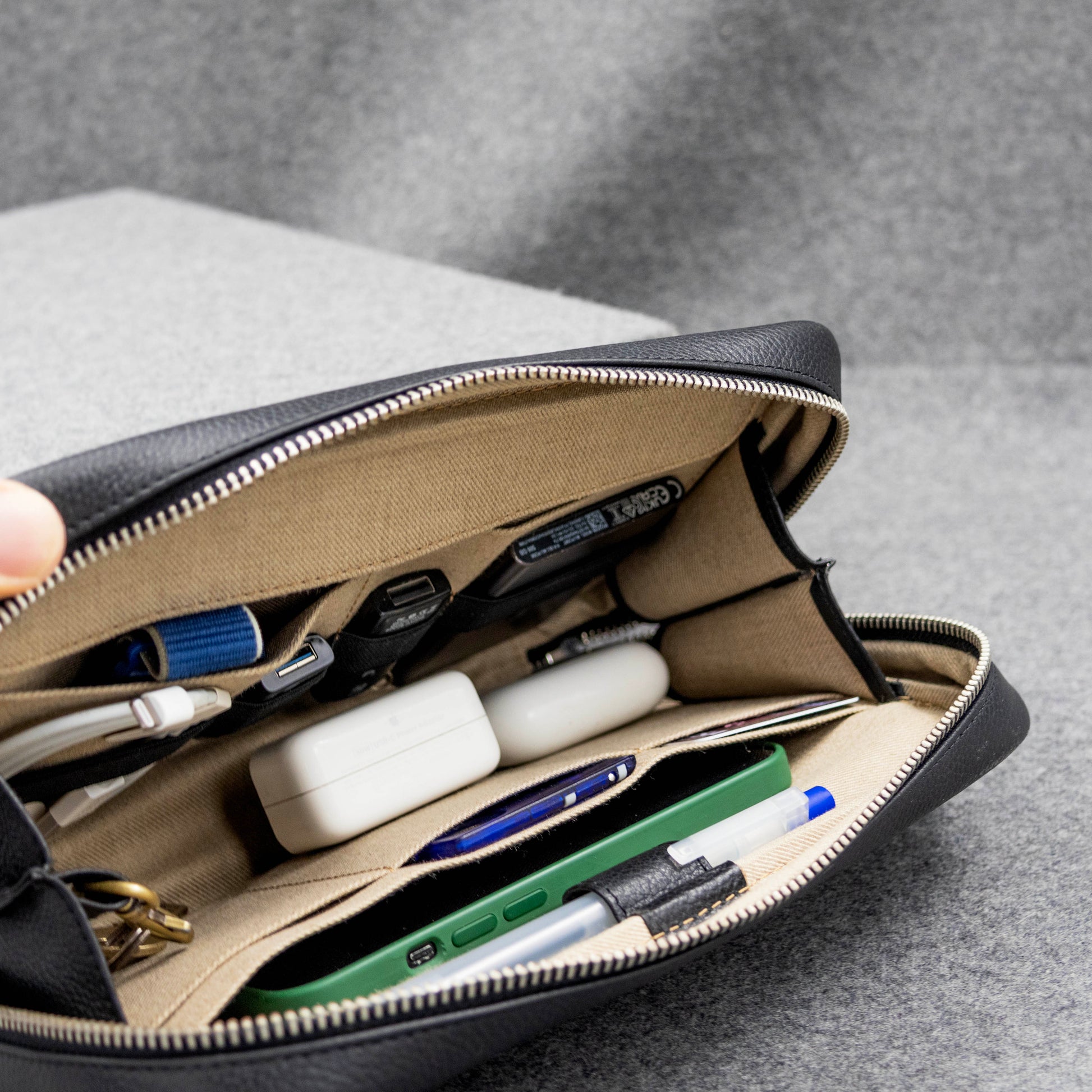 A Zippered leather pouch with detailed interior organization to store your tech gear