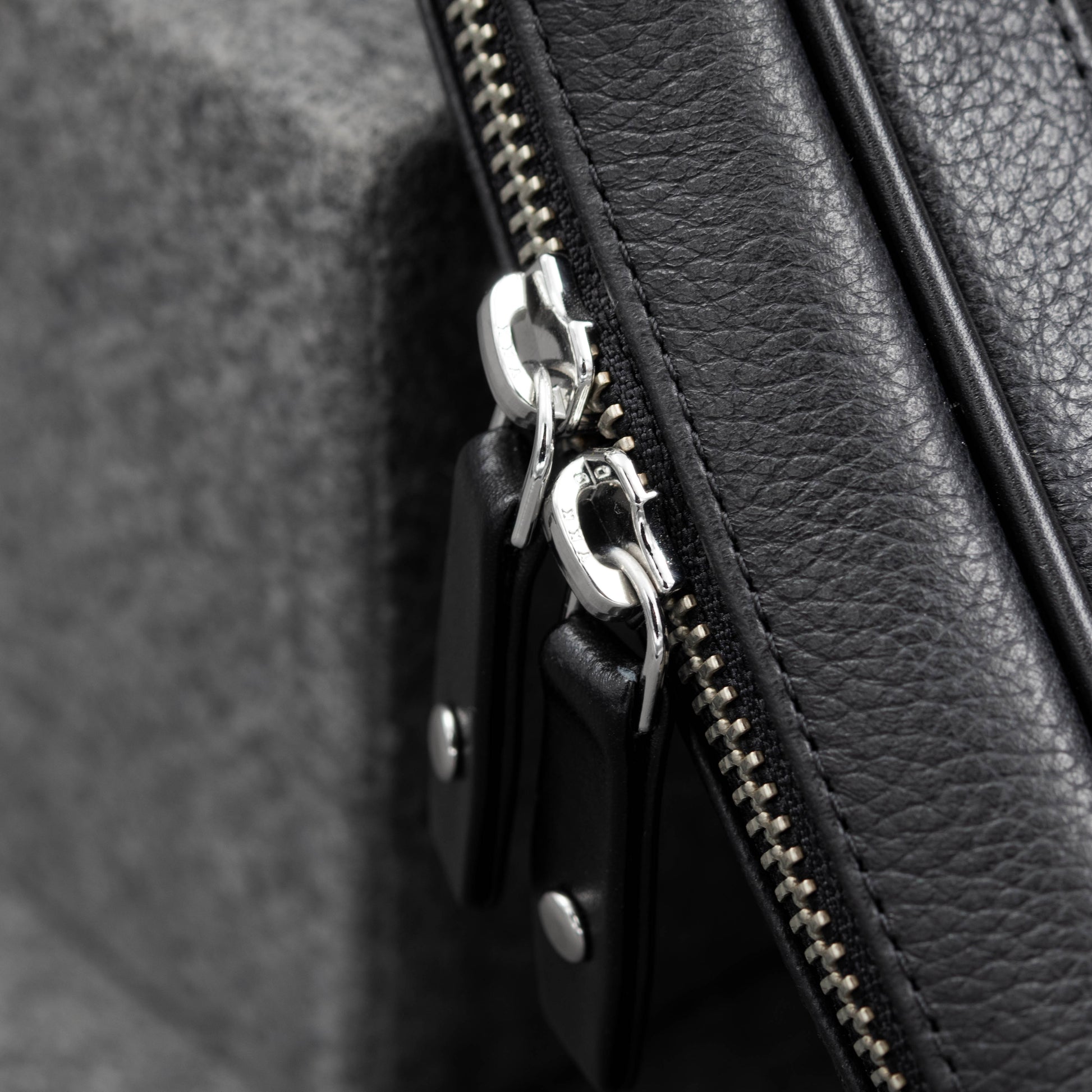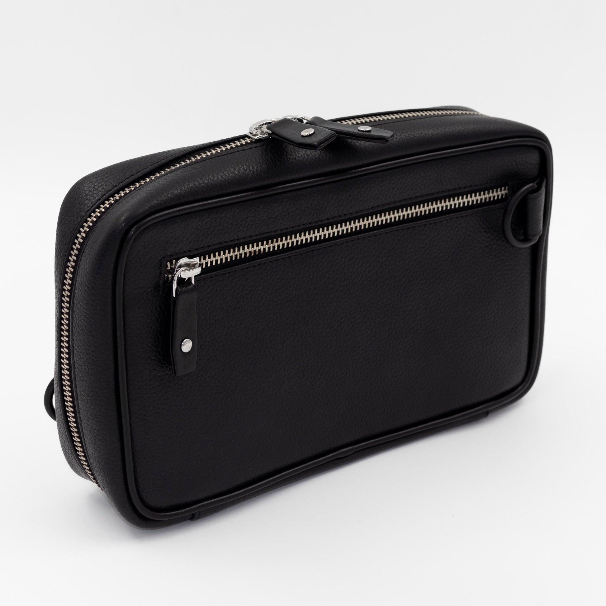 Handcrafted from black full-grain leather, boasting a distinctive pebble-grain texture.